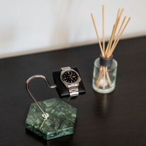 Kako bismo uskladili sve elemente, ovaj stalak za sat ima centralno postavljen osigurač i šipku što odaje utisak savršene simetričnosti.